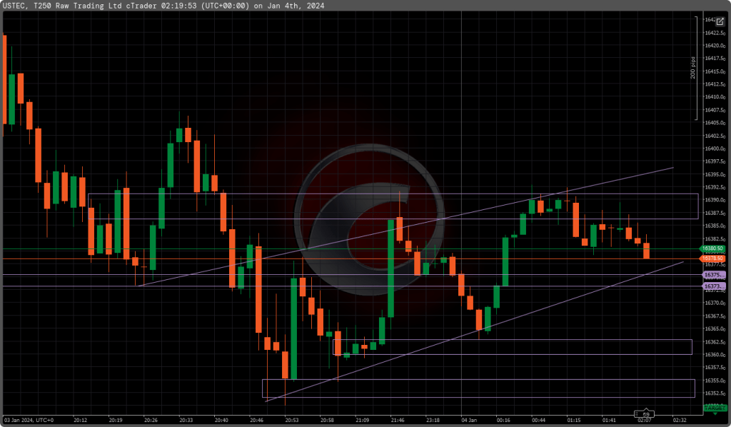The USTEC tick chart indicates a period of consolidation with potential for a significant price move in the near term. Traders should remain vigilant and watch for a breakout or breakdown from the current pattern to capitalize on the subsequent momentum.