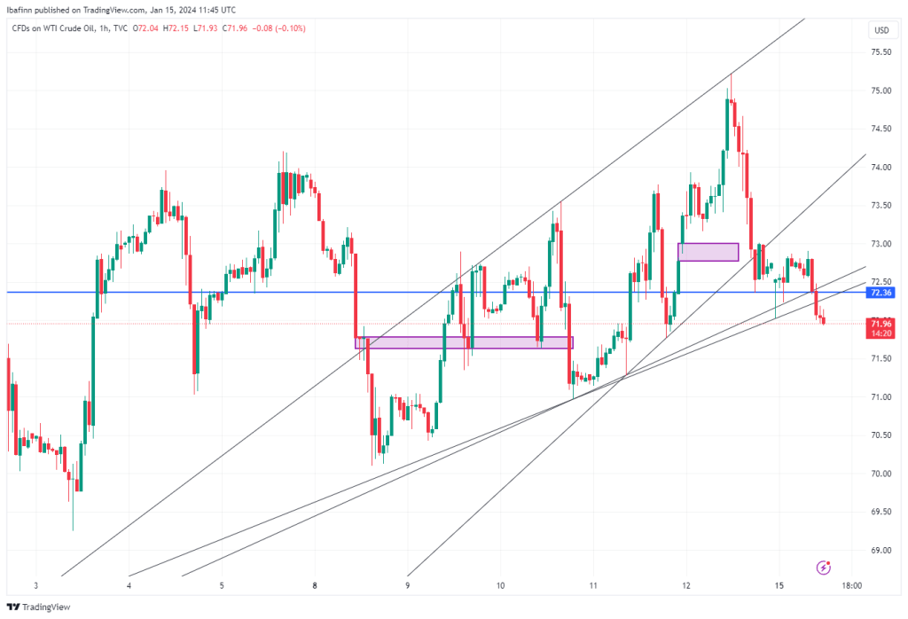 - The closing price as of the last candle on the chart is at $72.36, which is below the key psychological level of $73.00.