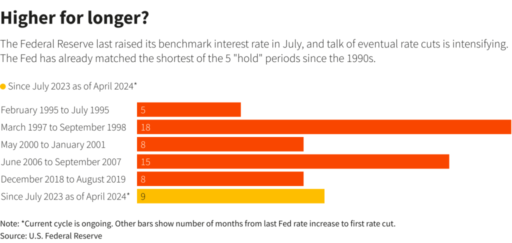 The latest cycle began in July 2023 and, as of April 2024, the Federal Reserve has been in a hold period for nine months. The ongoing economic climate suggests that this period may extend even further, with increasing talks of potential rate cuts in the near future.